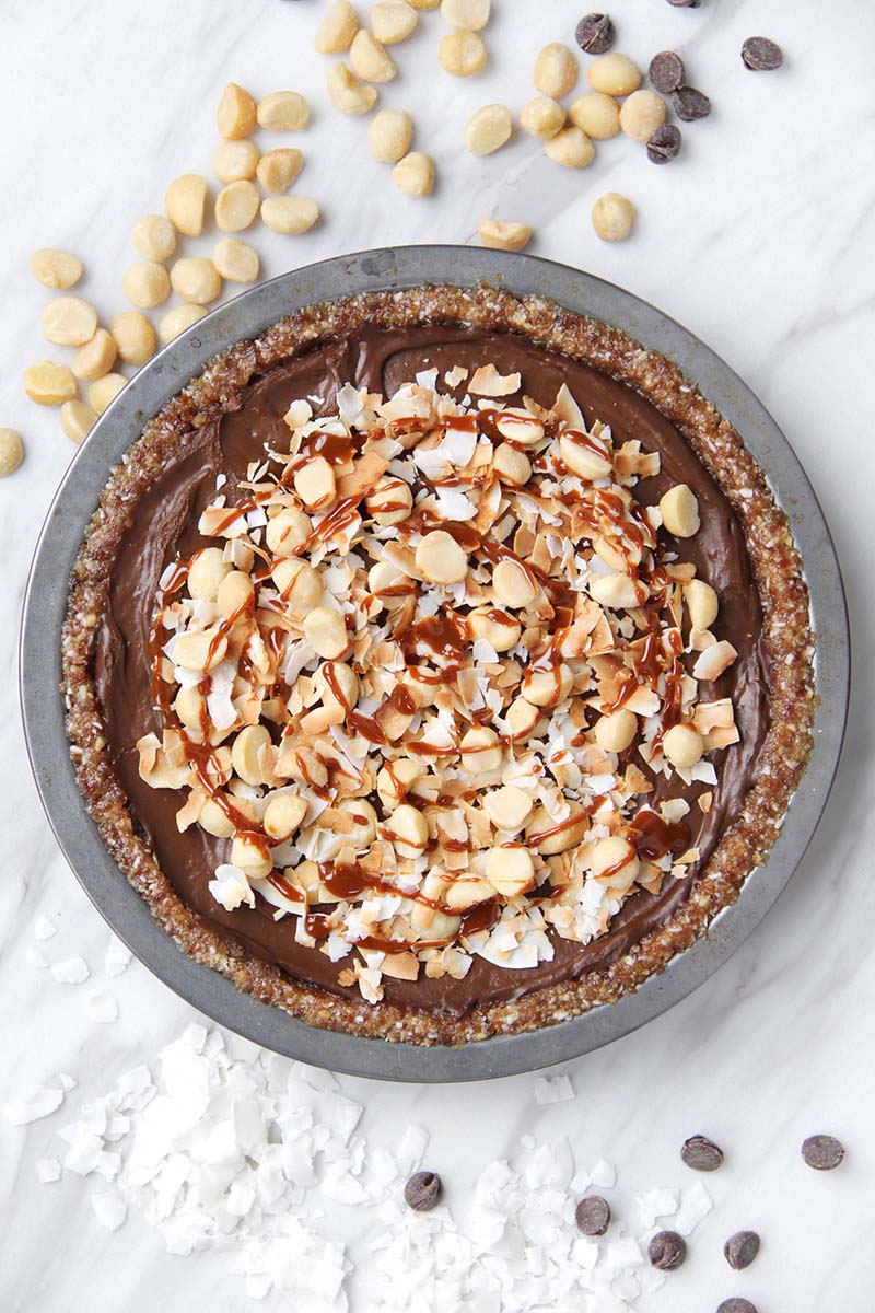 Inspired by the classic "turtle" flavor combination, this tropical Vegan Chocolate Coconut Macadamia Cream Pie is a secretly healthy treat that still feels indulgent. You'll never believe it's plant-based, grain-free, and naturally sweetened. That creamy filling is made from avocados!