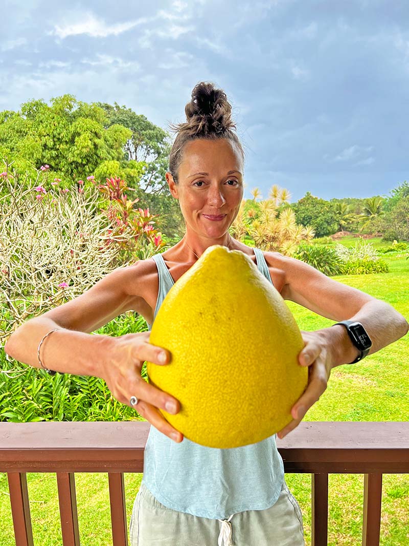 Can you tell that I get excited about these beautiful tropical ingredients? We're fortunate to be in Hawaii at the height of citrus season and can usually find some enormous pomelos. This one was especially impressive!